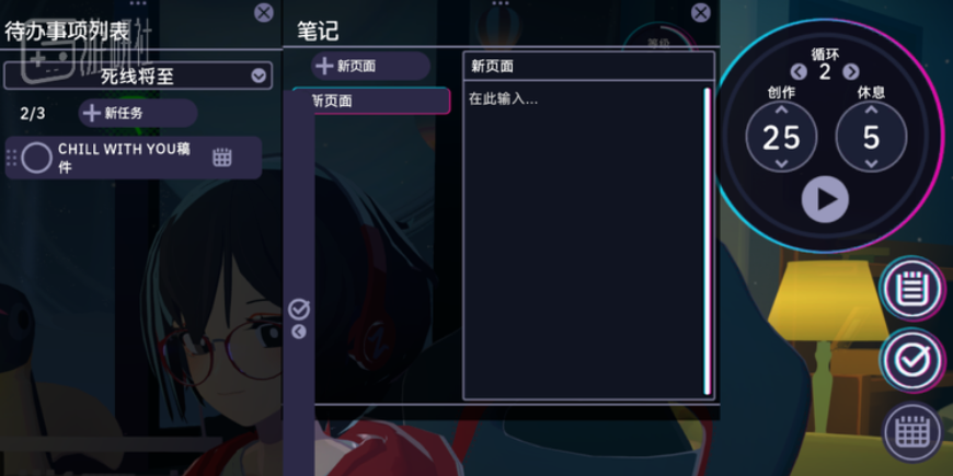 效率类应用的核心常围绕着“番茄钟工作法”展开,即通过拆分时间、劳逸结合来提升专注力。许多同类游戏也主要在此基础上进行玩法包装,例如通过专注时间获得游戏里的通用货币来购买家具等装饰来虚拟空间。而《放松时光》则提供了另一种思路:它将专注过程转化为与角色聪音的互动与陪伴,许多玩家习惯将游戏置于副屏,在学习的间隙抬头看去,聪音仿佛真实地坐在一旁。这种体验类似当下的“搭子文化”——有人相伴,做事更容易进入状态。